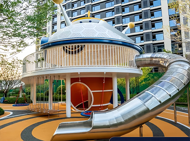 需预留足够缓冲空间(滑梯末端平坦区域≥1-2米),或铺设EPDM橡胶垫(厚度≥5cm)减少冲击力。