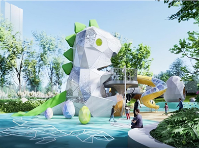 这个组合滑梯以恐龙为设计灵感,整体造型宛如一只憨态可掬的恐龙。恐龙的身体由多块几何形状的面板拼接而成,呈现出一种现代艺术风格。面板表面有着独特的纹理,仿佛恐龙坚硬的皮肤。恐龙的背部装饰着绿色的尖刺状结构,不仅增添了恐龙的威严感,还与周围的绿色植物相呼应。恐龙的眼睛大而圆,采用黄色调,显得炯炯有神,仿佛在注视着前来玩耍的孩子们。在恐龙的身体前方,还摆放着几个彩色的蛋形装饰物,有绿色、黄色和白色等,进一步强化了恐龙主题的氛围。