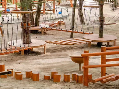 景观结合:在设计绳索桥的走向和位置时,要充分考虑周围的景观,如树木、花草、水体等,让使用者在通行过程中能够欣赏到优美的景色,增加趣味性。